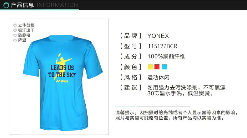 尤尼克斯YONEX 运动T恤115127BCR-576 男款 亮蓝色 产品信息: