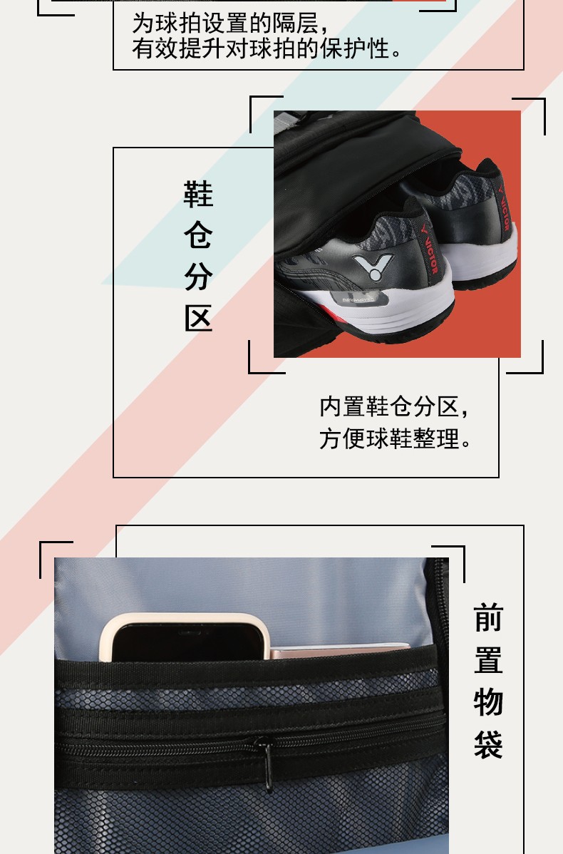 球拍隔层、独立鞋仓、前置物袋、侧置物袋