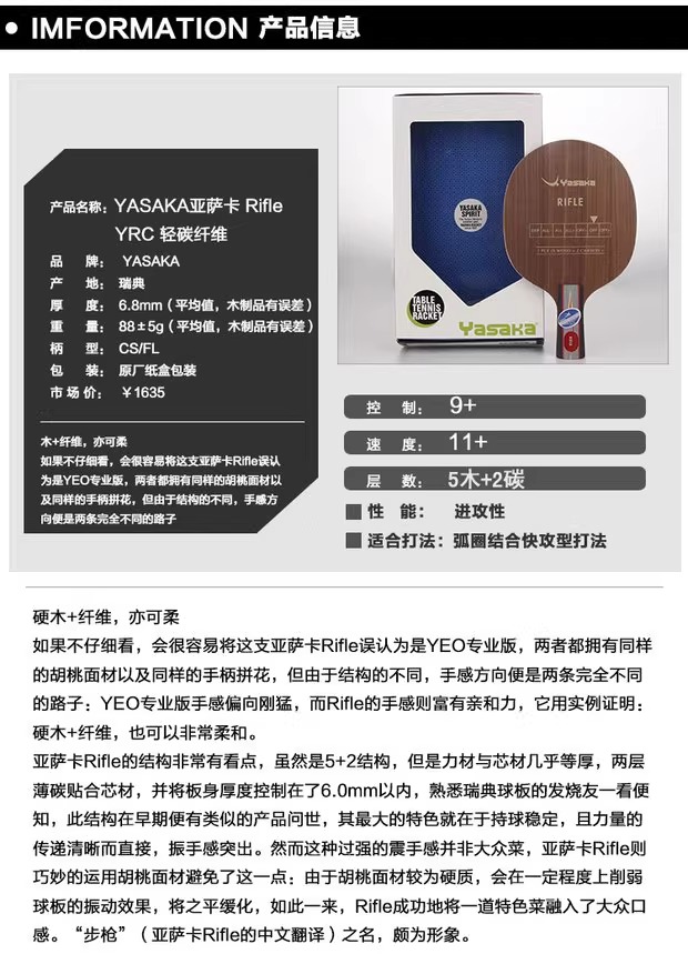YASAKA YRC(Rifle)轻碳乒乓球拍底板 性能参数: