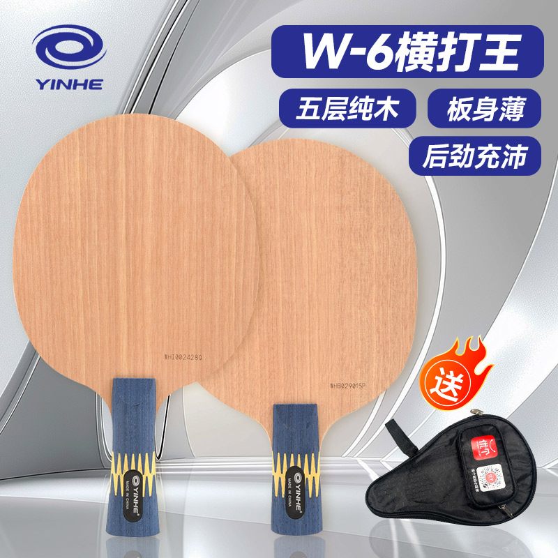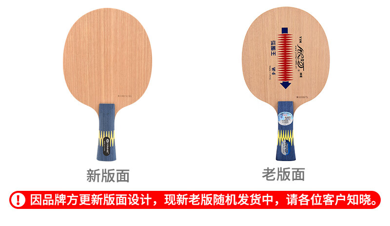 薄板身,五层纯木 直板名曰:“横打王”,专为横打技术设计的一款经典纯木底板。横板名曰:“弧圈王”,专为弧圈型打法设计的底板,后劲充沛