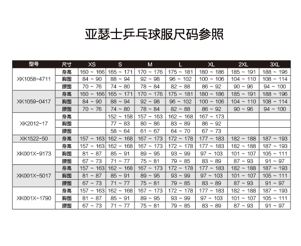 爱世克斯XK001X-9173 乒乓球服 尺码对照表
