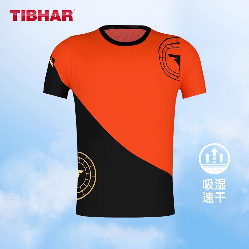 TIBHAR挺拔 德国乒乓球服 深蓝色圆领短袖 运动服 经典T标圆领上衣 02101-B 黑橙 轻薄透气,清凉体验