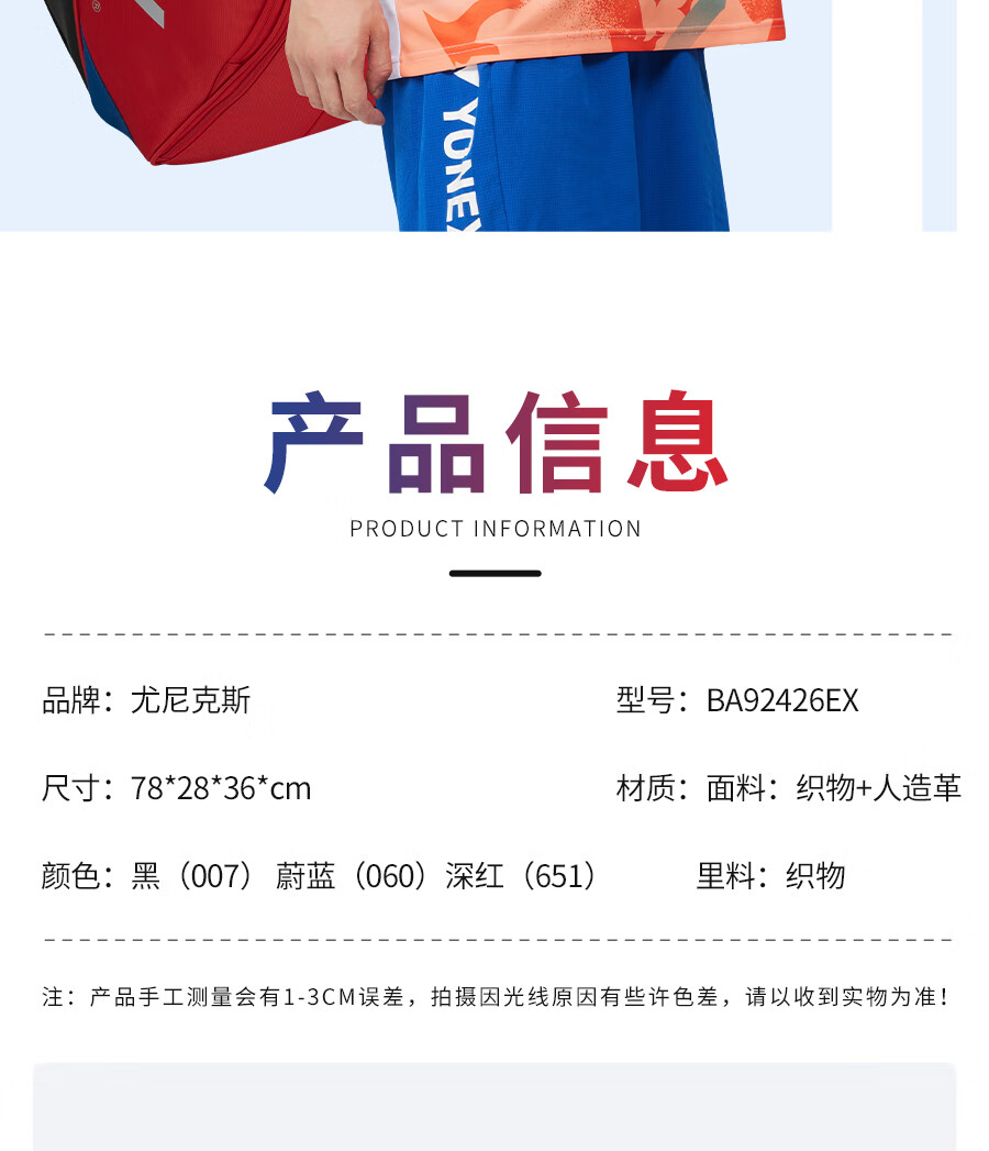 YONEX 尤尼克斯 羽毛球包 yy男女款 双肩运动背包 独立鞋仓球拍仓 BA92426EX 蔚蓝 本品参加12.12返场特惠满129减20 299减50 499减80 999减150元大促!