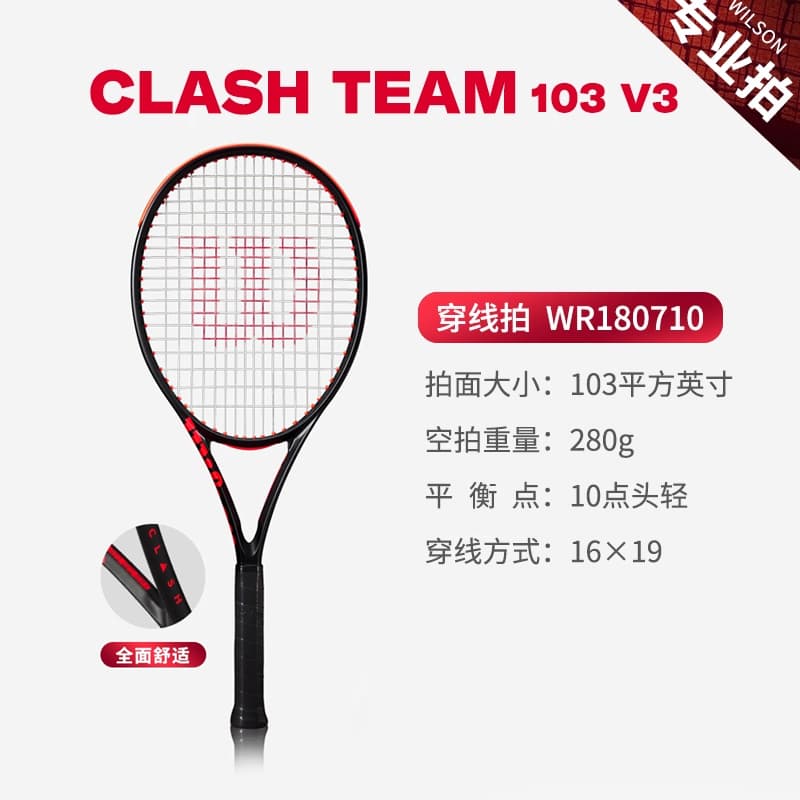 Wilson威尔胜网球拍 25新款CLASH TEAM 103 V3全碳素专业网拍全能型网球拍【成品拍】 103/280g WR180710 黑红初学者特别款,全面舒适,容错率提升,舒适的击球体验!