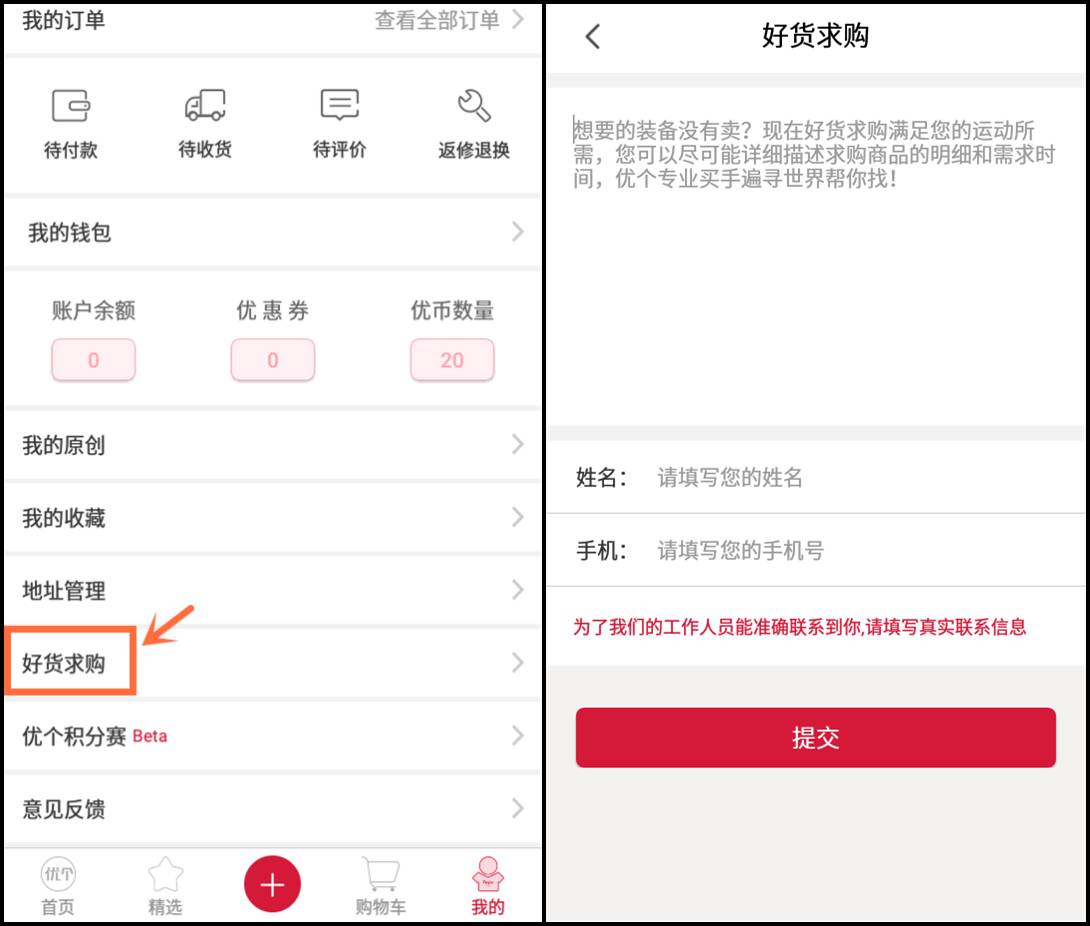 新增“好货求购”功能,发布求购详情,优个买手帮您找货。想要的货品没有卖?现在好货求购满足您的运动所需,您可以尽可能详细描述求购商品的明细和需求时间,优个专业买手遍寻世界帮你找!