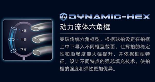 1 动力流体六角框设计,球拍采用 了上薄中圆下方的设计,提升挥拍速度,增强球拍的抗扭性和稳定性。
