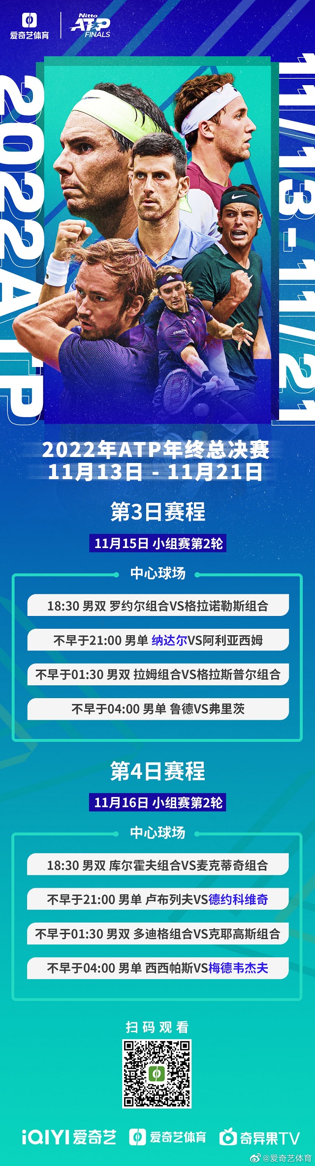 2022ATP年终总决赛,都灵年终总决赛,ATP年终总决赛赛程看点,2022ATP年终总决赛今晚开启第三比赛日,绿组四名成员将再度下场进行次轮较量!首轮的两名赢家,鲁德与弗里茨将争取在晋级道路上更进一步。双方之前未曾交手,你更看好谁的出线前景呢?另两位失意者,纳达尔与阿利亚西姆将为小组出线而战,此战两人都不容有失。虽然纳达尔对FAA保持着两战全胜的记录,但都是在前者擅长的红土赛场,此番来到室内硬地,是战神老骥伏枥重整旗鼓,还是小将调整状态绝地反击?