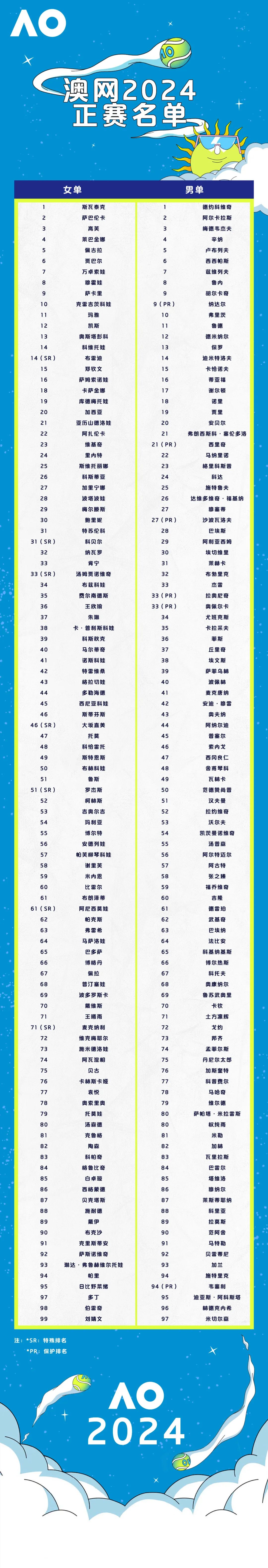 2024年澳网正赛男女单打名单:张之臻、郑钦文、朱琳、王欣瑜、王曦雨、袁悦、白卓璇凭借排名直接入围。吴易昺、商竣程、布云朝克特、王雅繁、尤晓迪则要从资格赛打起。戴维斯因肩伤宣布退出今年澳网,前美网冠军拉杜卡努进入正赛。法网亚军穆霍娃因伤退出2024澳网,替补名单中排在第1位的王雅繁,成功递补获得了澳网正赛资格。