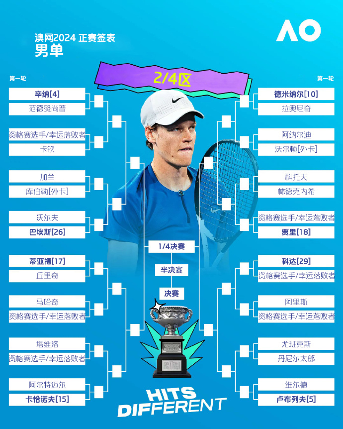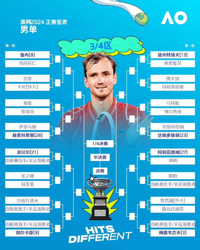 男单正赛名单,德约科维奇、阿尔卡拉斯、梅德韦杰夫、辛纳领衔男单阵容。纳达尔、西里奇、沙波瓦洛夫、拉奥尼奇、奥佩尔卡、维塞利凭借保护排名参赛。如果没有人退赛的话,第98位的蒂姆将不得不从资格赛打起。科维托娃退出今年澳网争夺,泽丹塞克进入正赛。