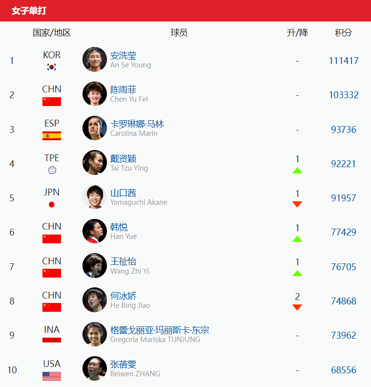 【女单】陈雨菲2,韩悦上升1至6,王祉怡上升1至7,何冰娇下滑2至8,张艺曼下滑1至16,高昉洁上升2至32,陈鲁101,邬洛愉下滑1至120。