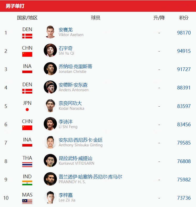【男单】石宇奇2,李诗沣6,翁泓阳上升1至16,陆光祖19,雷兰曦下滑1至34,赵俊鹏上升5至40,刘亮129,王正行133,董天尧下滑2至245。