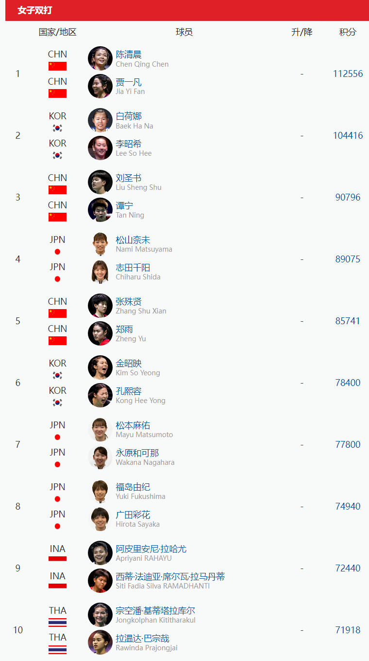 【女双】陈清晨/贾一凡1,刘圣书/谭宁3,张殊贤/郑雨5,李汶妹/刘玄炫上升1至15,李怡婧/罗徐敏上升1至22,坑姝良/张驰上升1至42,王汀戈/王漪朵下滑1至101,刘圣书/张殊贤上升2至161。