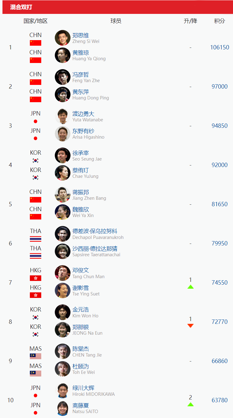 【混双】郑思维/黄雅琼1,冯彦哲/黄东萍2,蒋振邦/魏雅欣5,程星/陈芳卉上升1至25,程星/张驰上升1至49,周志宏/杨嘉怡上升13至87,郭新娃/陈芳卉144。