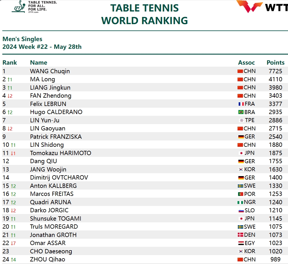 马龙排名上升1个名次位列第2;梁靖崑排名上升1个名次位列第3;雨果·卡尔德拉诺(2935)排名上升2个名次位列第6;安宰贤排名上升10个名次位列第27,刷新个人职业生涯新高;艾利克斯·勒布伦排名上升6个名次位列第29;田中佑汰排名上升20个名次位列第52;卢卡·姆拉德诺维奇排名上升36个名次位列第86,刷新个人职业生涯新高。