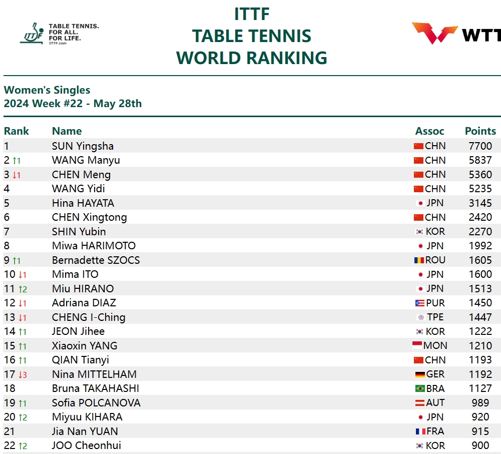 国际乒联最新排名公布-中国乒乓球队女单世界排名: