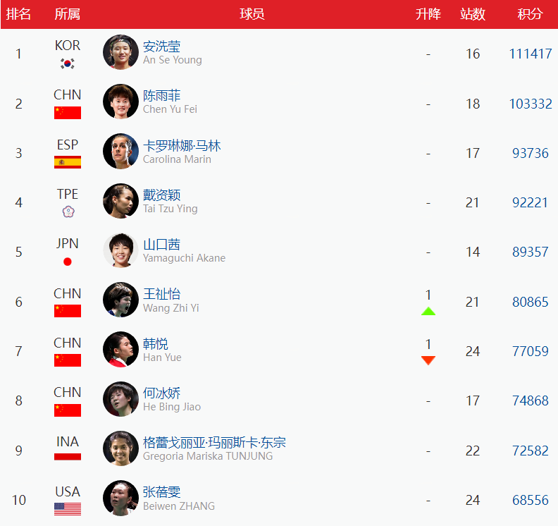 【女单】陈雨菲位于第2。在马来西亚大师赛有着出色发挥的王祉怡上升到第6,韩悦、何冰娇位列第7和第8,张艺曼位列第15,高昉洁位列第33。
