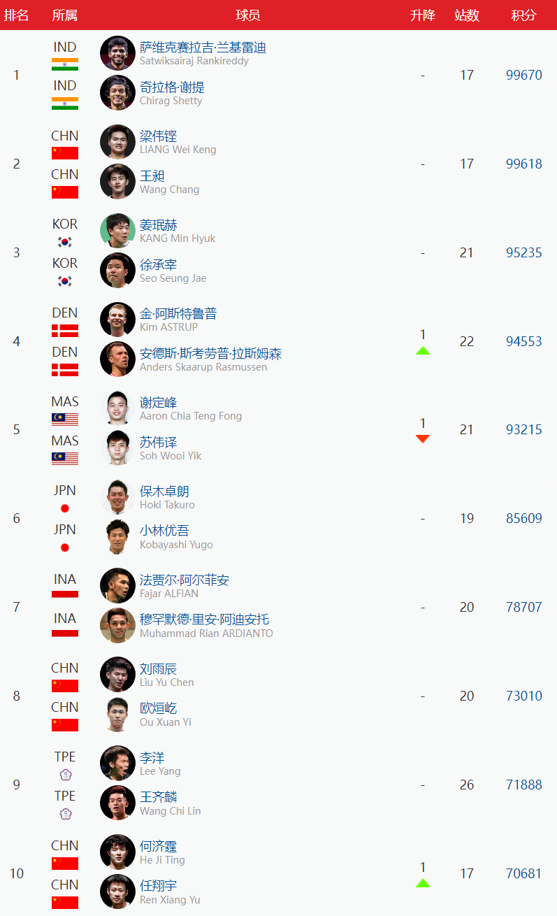 【男双】梁伟铿/王昶位居第2,刘雨辰/欧烜屹位居第8,何济霆/任翔宇位居第10,创职业生涯新高。陈柏阳/刘毅位于第22。