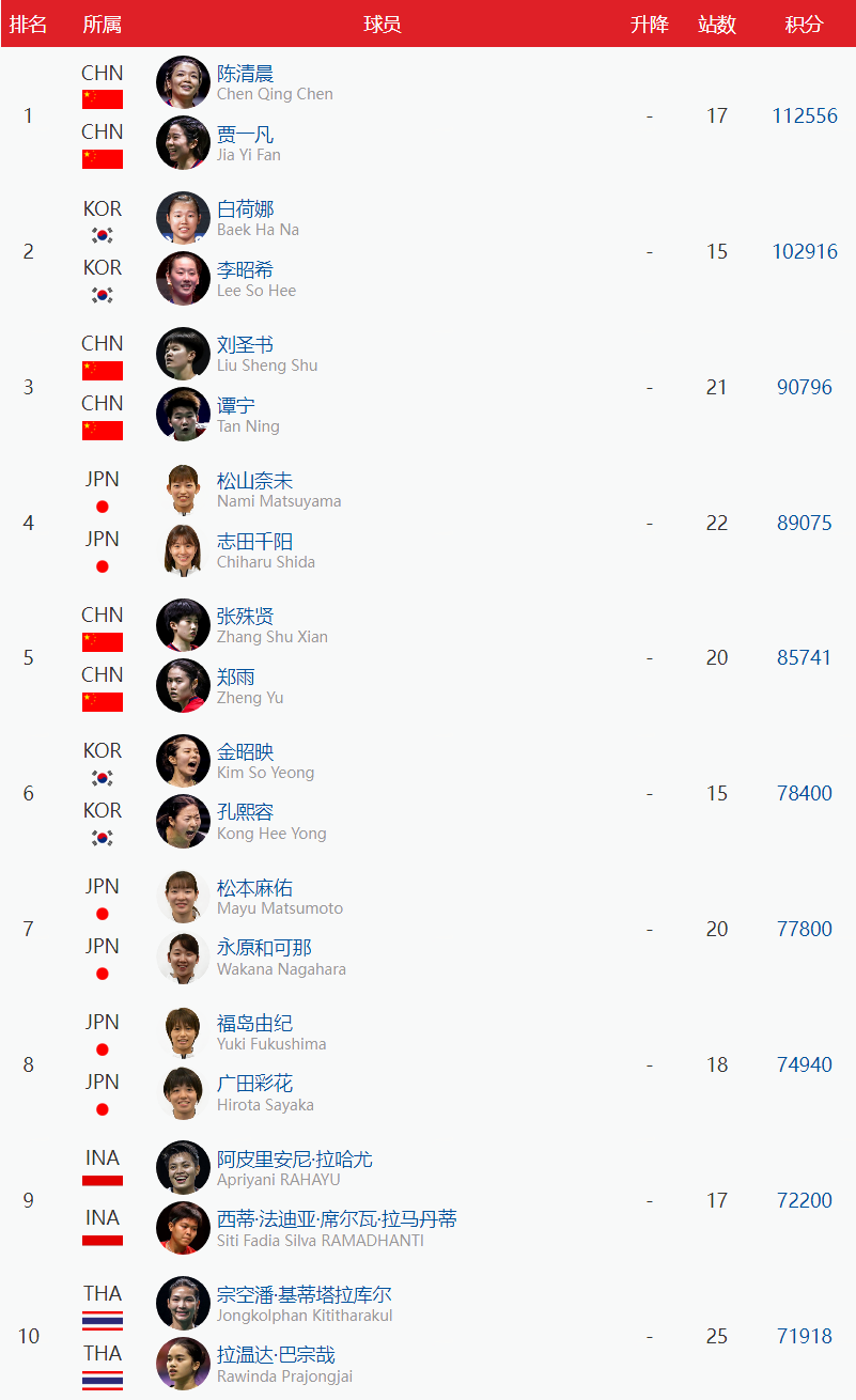 【女双】凡晨组合继续位列第1,刘圣书/谭宁位于第3,张殊贤/郑雨位于第5,李汶妹/刘玄炫位于第14,李怡婧/罗徐敏位于第22。