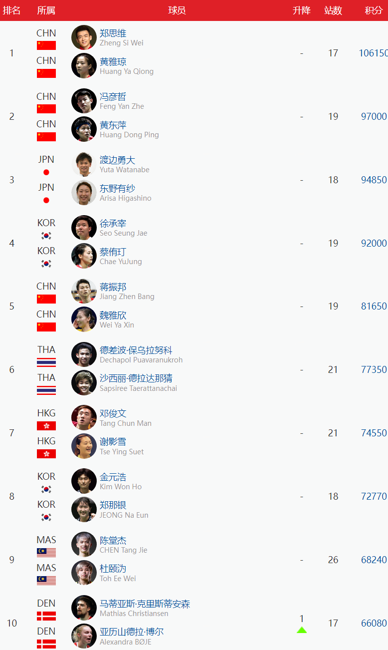 【混双】郑思维/黄雅琼位居第1,冯彦哲/黄东萍位于第2,蒋振邦/魏雅欣位于第5,程星/陈芳卉位于第25。