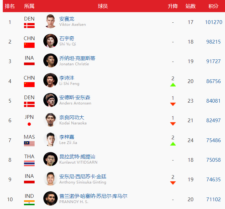 【男单】石宇奇位列第2,李诗沣位列第4,陆光祖位列第15,翁泓阳位列第19,雷兰曦位列第33,赵俊鹏位列第40。