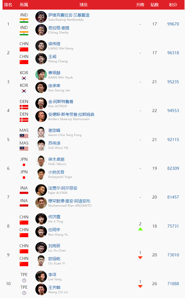 【男双】梁伟铿/王昶位居第2,何济霆/任翔宇位居第8创职业生涯新高,刘雨辰/欧烜屹位居第9,陈柏阳/刘毅位于第21。