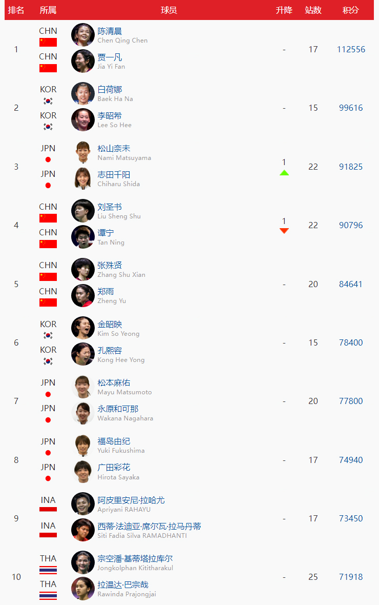 【女双】凡晨组合继续位列第1,刘圣书/谭宁位于第4,张殊贤/郑雨位于第5,李汶妹/刘玄炫位于第17,李怡婧/罗徐敏位于第23。