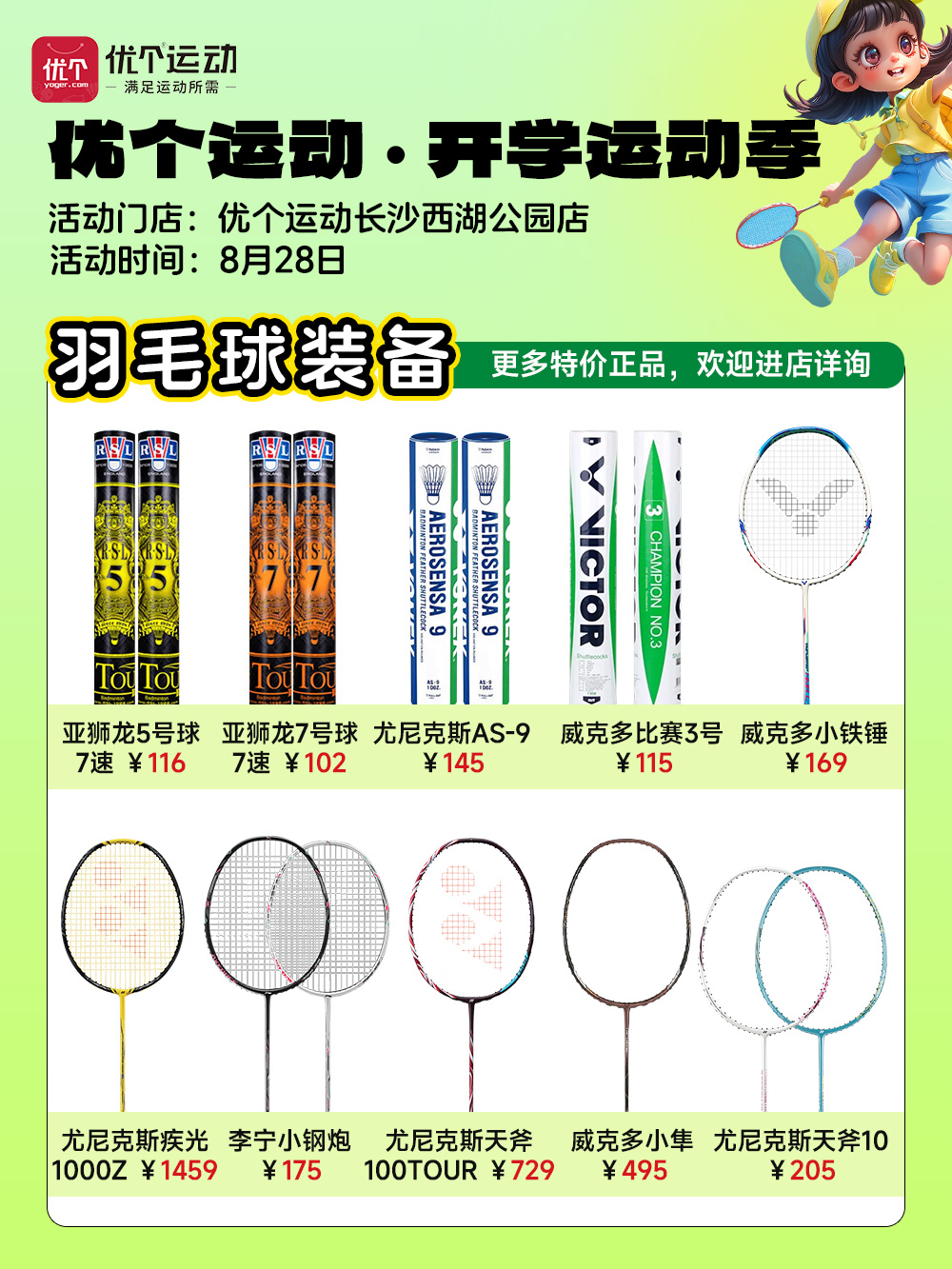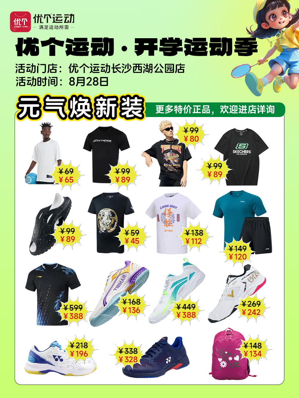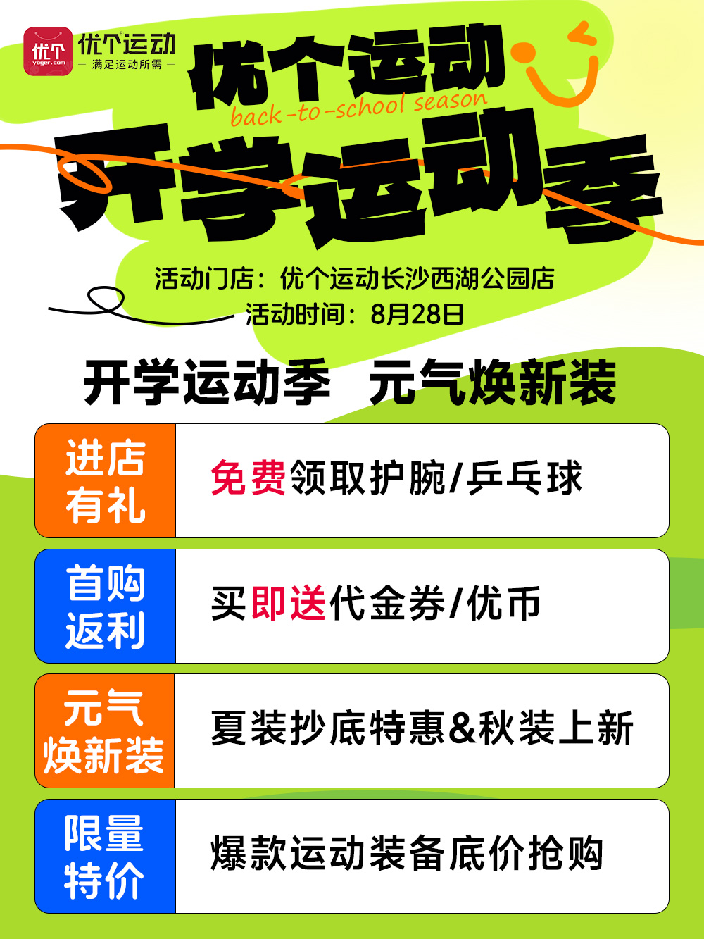 优个运动长沙西湖公园店8月28日进店有礼!特价限量抢爆款装备!