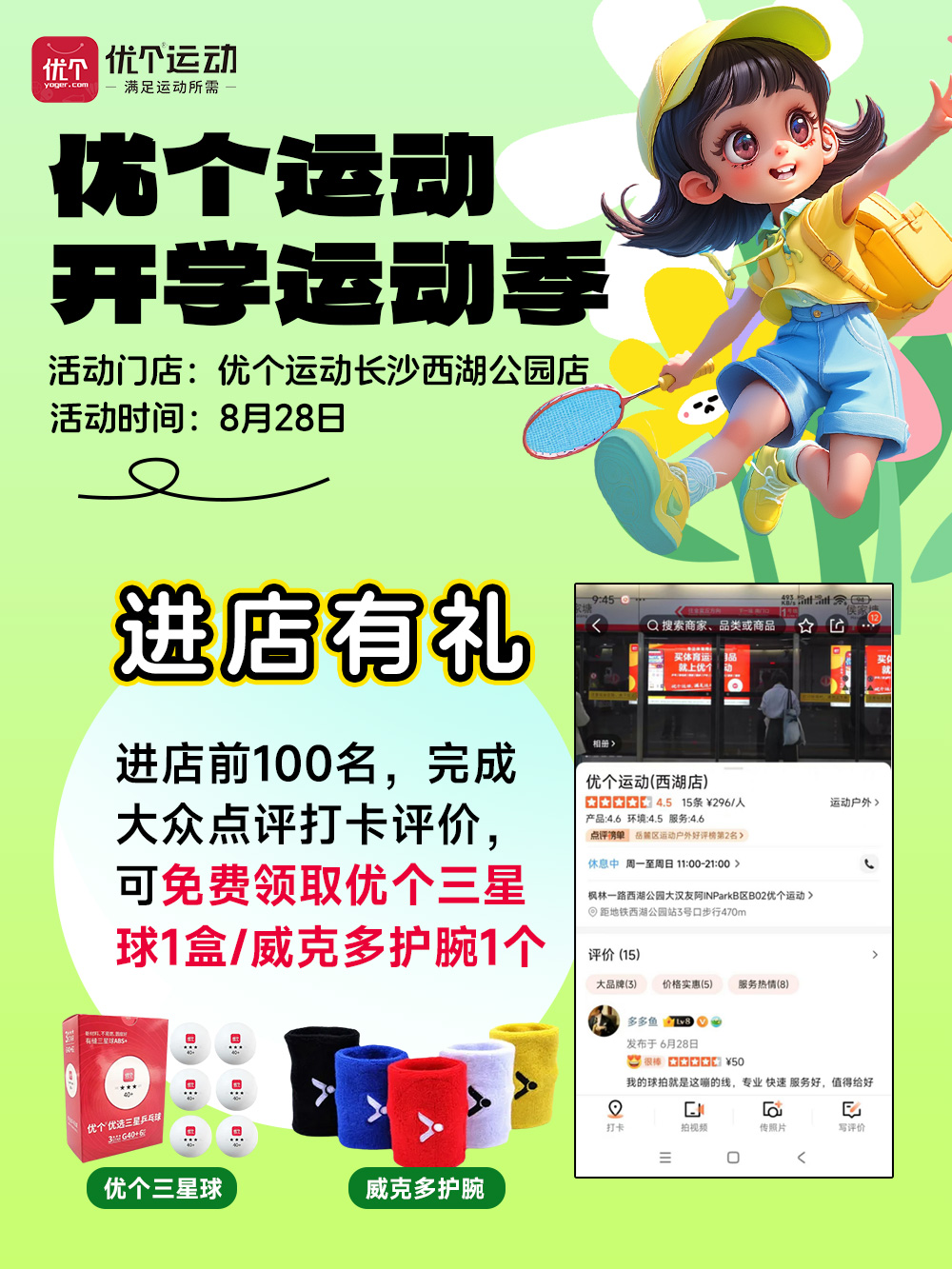 进店有礼 · 小红书/大众点评打卡,即可免费领取威克多护腕1个or乒乓球1盒,仅限进店前100人