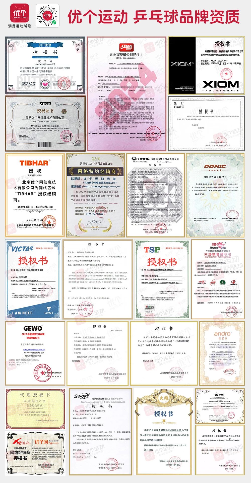 优个运动乒乓装备合作品牌包括蝴蝶Butterfly、红双喜DHS、斯帝卡Stiga、挺拔TIBHAR、友谊729、银河YINHE、李宁LI-NING、多尼克DONIC、骄猛XIOM、双鱼Double Fish、亚萨卡Yasaka、维克塔斯VICTAS、优拉JOOLA、尼塔库Nittaku、亚瑟士asics、捷沃GEWO、美津浓Mizuno、拍里奥Palio、三维SANWEI、海夫Haifu、TSP、速博特SPEED ART、郗恩庭、达克Daker、琉蓝、桧族、阳光SUNFLEX、庞伯特PONGBOT、岸度Andro、雷神LOKI、世奥得SWORD、典驰、雷蛇RAZER、赛维卡SAVIGA、塔特尔TUTTLE、美国iPong、北新地材等。