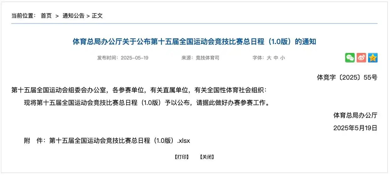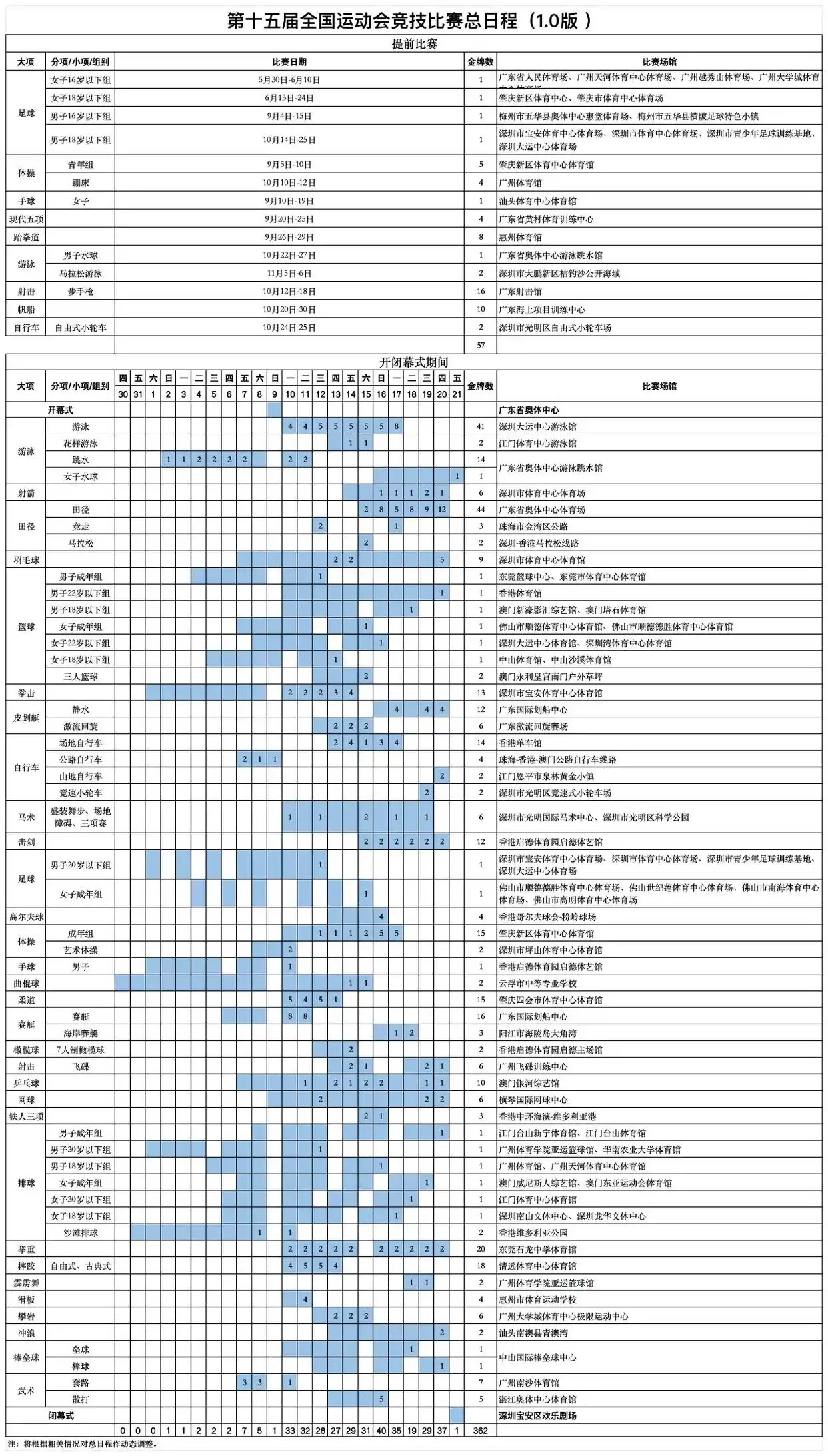 第十五届全国运动会将于11月9日—21日在粤港澳三地举行。5月19日,国家体育总局公布了十五运会竞技比赛总日程(1.0版)。