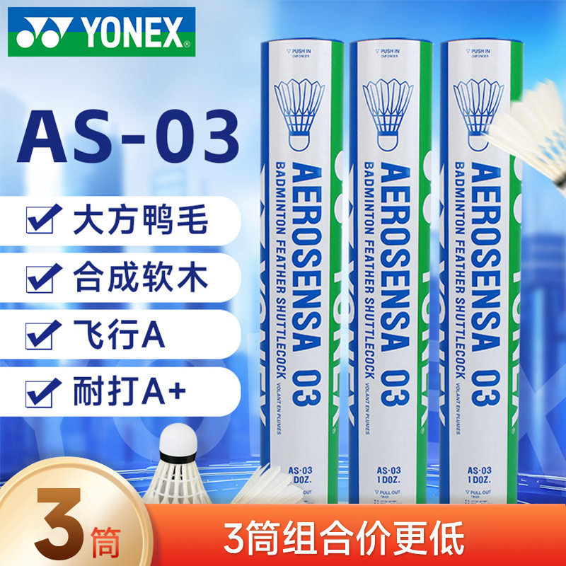 YONEX尤尼克斯AS-03羽毛球 as03 (超耐打,飞行稳定,声音悦耳,击球感美妙) 3筒装