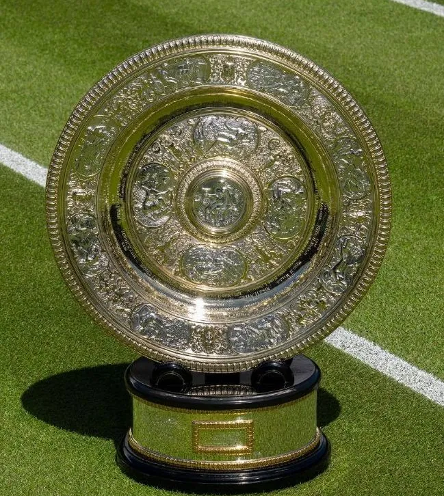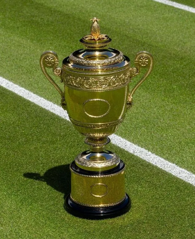 温网男单奖杯为全英俱乐部 1887 年起颁发的镀银奖杯,高 18 英寸、直径 7.5 英寸,刻有 “全英草地网球俱乐部世界单打冠军” 铭文及历届冠军夺冠日期和姓名;2009 年因无空间刻新冠军姓名,搭配带装饰银带的黑色基座,冠军获刻有所有往届冠军姓名的 13.5 英寸四分之三大小复制品。