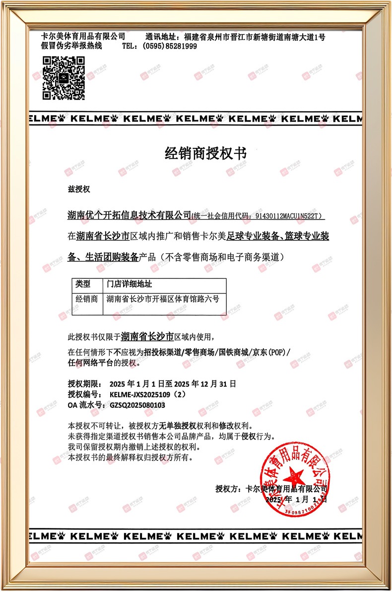 优个运动持有卡尔美品牌方颁发的正式官方授权证书,所有在售卡尔美商品均通过品牌严格审核,100%品牌直供,绝无假货!
