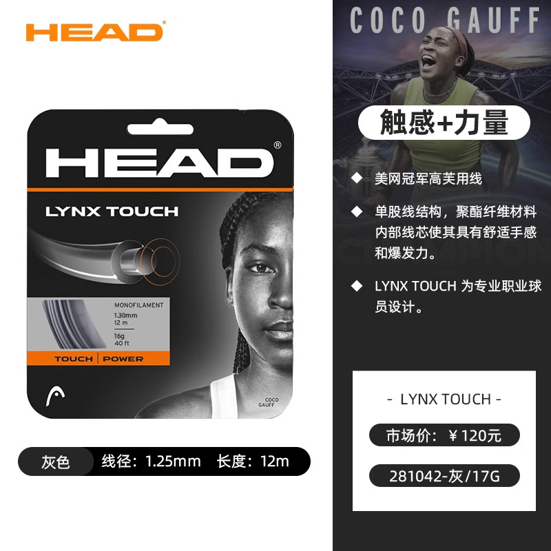 海德HEAD网球线 高芙同款LYNX TOUCH网球线聚酯线硬线网球拍线 281042 1.25MM 灰色