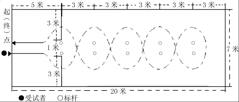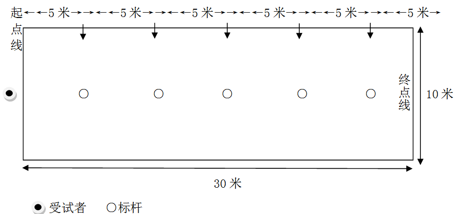 考生站在起点线后准备,听到“出发”指令后,按图示中箭头所示方向开始向前运球依次绕杆,同时计时开始。通过最后一个标志杆后,到达终点前,至少触球一次。考生与球均通过终点线时,计时停止。以秒为单位记录测试成绩,向上取整,精确到0.1秒,如10.11秒按照10.2秒计取。每人可测试2次,记录其中最好的一次成绩。
