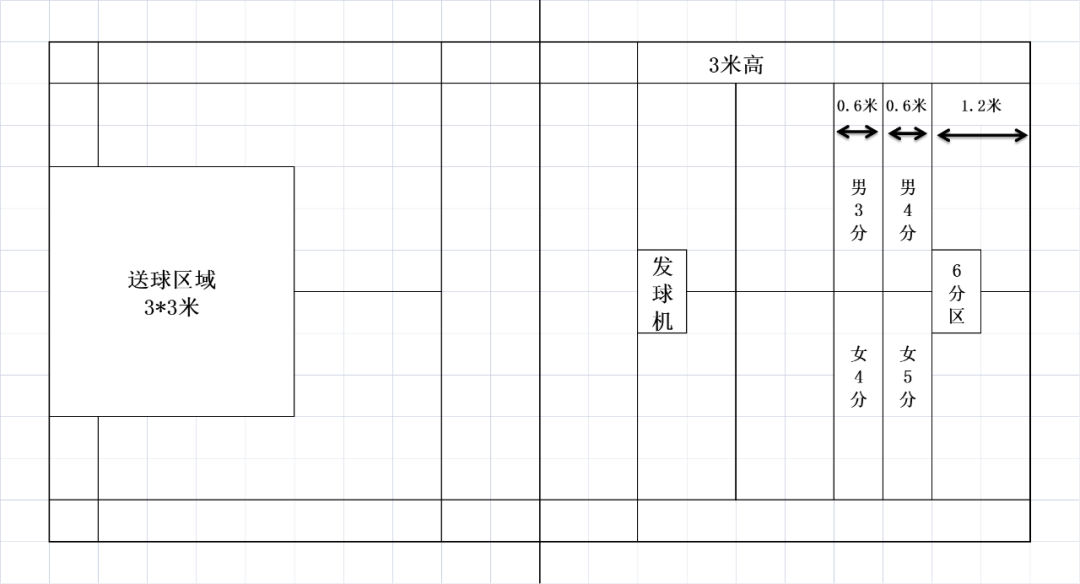 男子落地有效区域分值划分:从底线向内1.2米为6分区,1.2-1.8米为4分区,1.8-2.4米为3分区。女子落地有效区域分值划分:从底线向内1.2米为6分区,1.2-1.8米为5分区,1.8-2.4米为4分区。