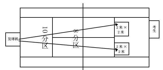 (1)考试开始,由羽毛球发球机送球,频率为23个球/70秒;以高远球发至规定区域内,考生以高远球将球击至对面单打场地有效落地区域内,考生回球须越过空中标志线,击球出界为无效球。