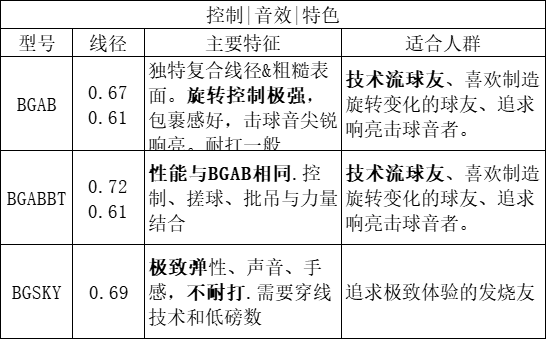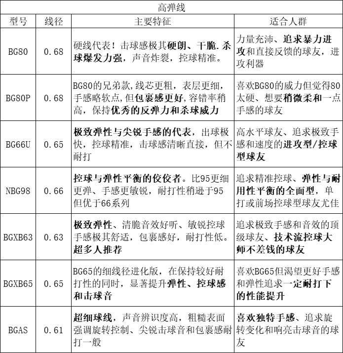 线越细,弹性就越好,越弹越容易击打,对新手、力量不强的球友就越友好。0.68毫米以下的线基本都属于高弹型线。