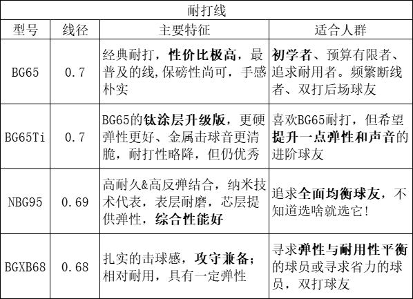 耐用型的线相对略粗,线径基本都是0.7毫米左右,因为粗,不容易断,主打就是耐用,弹性就会减弱,适合经济型的球友。