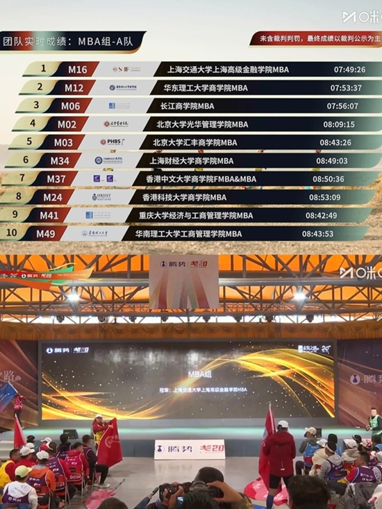 当最后一缕夕阳为敦煌戈壁镀上金辉,2025 年 10 月 4 日,第 20 届玄奘之路戈壁挑战赛(简称 “戈 20”)MBA 组的征程在甘肃瓜州县戈壁清泉画上圆满句点。19 支高校 MBA 战队、近 300 名青年精英,用 4 天 3 夜的脚步丈量 121 公里的风沙征途,在雅丹的沟壑与黑戈壁的碎石间,不仅角逐出竞技的胜负,更镌刻下 “理想、行动、坚持” 的青春印记 —— 最终,上海交通大学上海高级金融学院(SAIF / 高金)MBA A 战队以 7 小时 42 分的总成绩摘得桂冠,华东理工大学商学院、长江商学院 MBA 战队分获亚季军,共同为戈赛二十周年写下热血注脚。