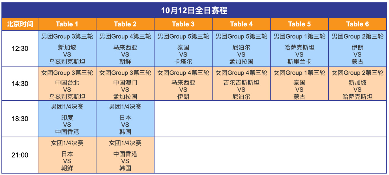 第28届亚洲乒乓球团体锦标赛丨10月12日全日赛程