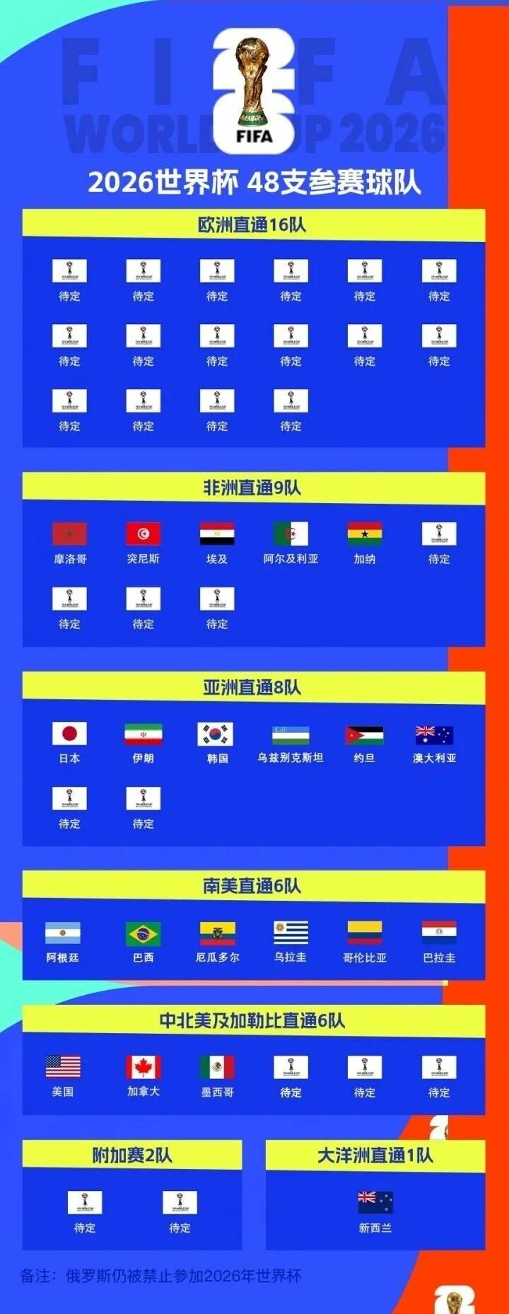 目前2026年世界杯已确定21席,分别是:美国、墨西哥、加拿大、日本、新西兰、伊朗、阿根廷、乌兹别克斯坦、韩国、约旦、澳大利亚、巴西、厄瓜多尔、乌拉圭、巴拉圭、哥伦比亚、摩洛哥、突尼斯、埃及、阿尔及利亚、加纳。
