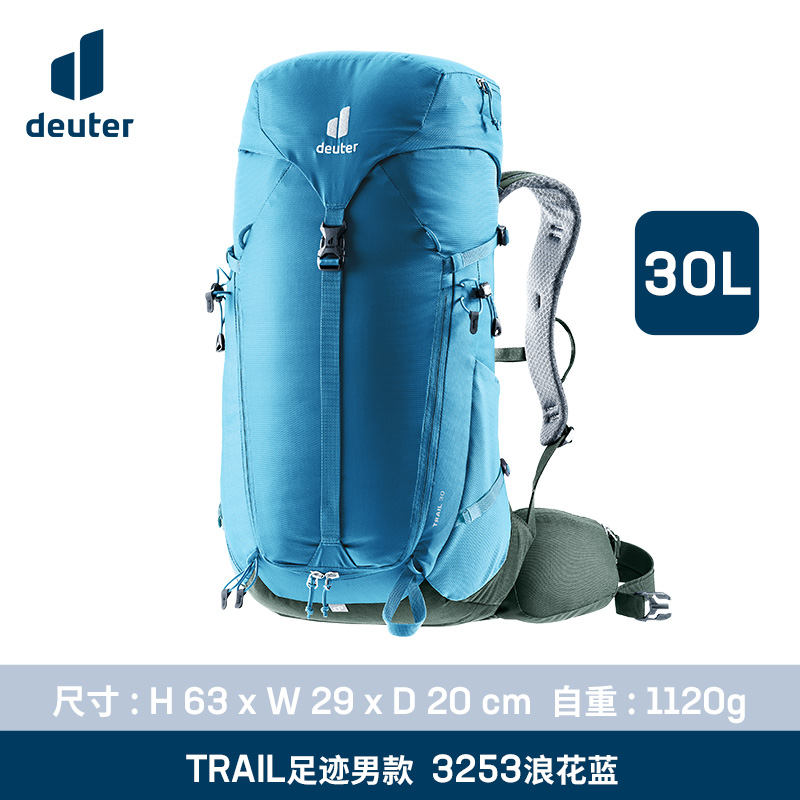 核心卖点:30L 大容量适配多日徒步,1120g 自重兼顾轻量与装载,浪花蓝颜值吸睛,专业背负系统分散重量,户外探险、多功能旅行首选。