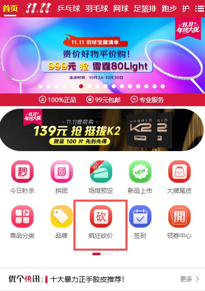 打开 优个运动APP 或 优个运动小程序,在首页中间点击「疯狂砍价」,即可进入活动专区,开启你的砍价之旅!