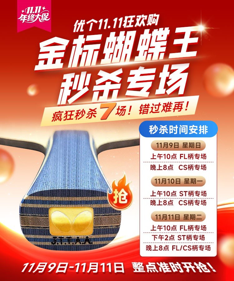 金标蝴蝶王停产了吗? 哪里可以买到正品金标蝴蝶王? 优个运动为您提供11.11狂欢购金标蝴蝶王超级秒杀,欲购从速!11月9日-11日3天7场金标蝴蝶王限时开抢!买正品金标蝴蝶王,就上优个运动!优个运动11.11狂欢购福利钜献,299元即可入手国狂蓝海绵!张继科ALC 5天9场疯狂秒杀!