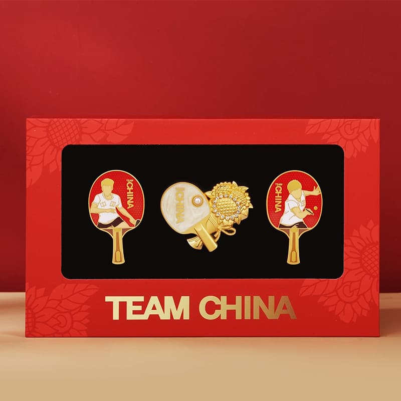 TEAM CHINA中国国家队 乒出辉煌 典藏级徽章套装 镌刻运动员挥拍英姿,融入向阳而生的向日葵,寓意“一举夺魁”,闪耀冠军之路