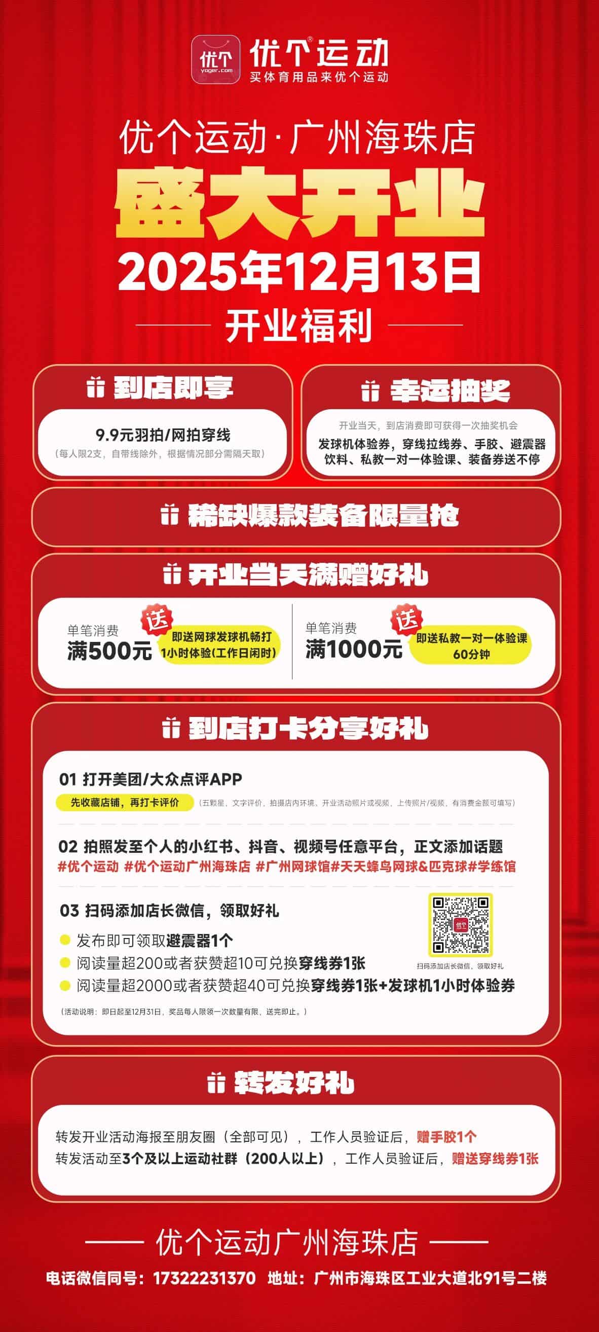 作为优个运动在广州的加盟连锁重要布局,海珠店将深度融入本地运动圈,通过网球匹克球培训学练、赛事互动、装备体验等活动,与运动爱好者建立长期信任。同时,门店将依托优个运动强大的供应链优势,让广州运动爱好者以更优成本获取专业装备。