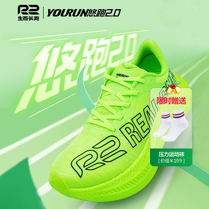 R2 悠跑2.0跑鞋 男女款马拉松跑鞋 秋季轻便缓震回弹透气跑步鞋 运动休闲鞋 荧光绿