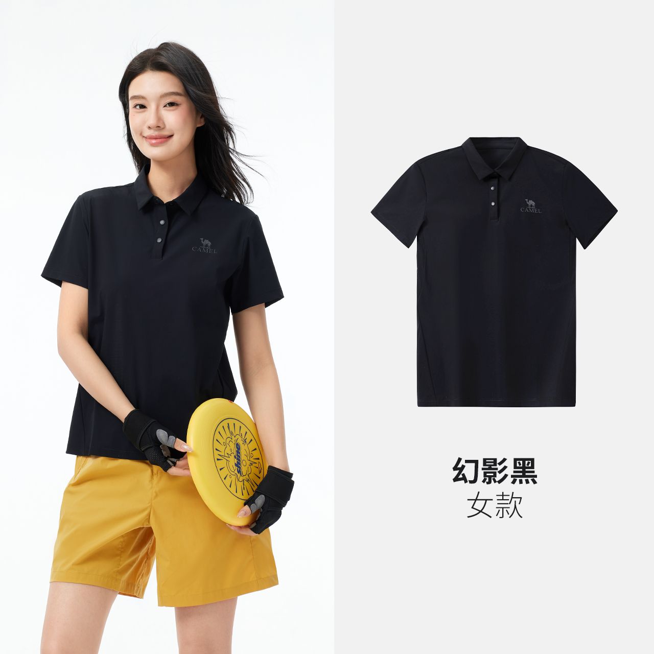CAMEL骆驼 户外速干T恤 男女款夏季防晒短袖POLO衫弹力抗皱上衣 幻影黑-女款 A25BZ01059