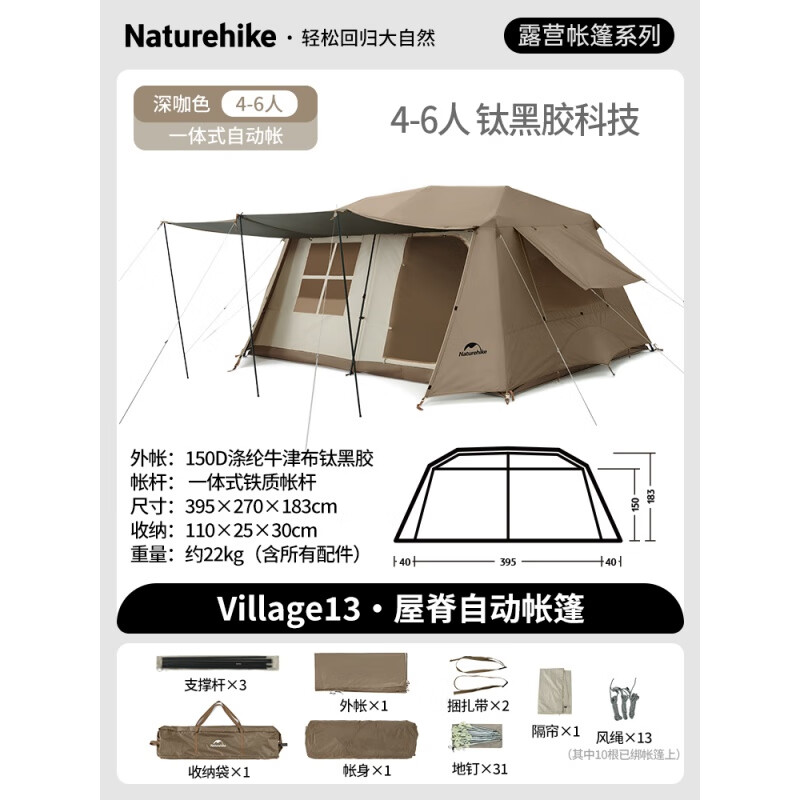 Naturehike挪客 屋脊13自动帐篷 CNH22ZP004 户外露营野营装备过夜两室一厅帐篷 钛黑胶深咖色